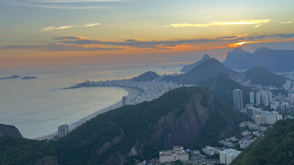 Lever de soleil à Dois Irmãos : Une expérience unique. Il faut traverser la favela de Vidigal (prenez une moto-taxi à l’entrée, c’est safe et encadré, possibilité de passer via une agence) pour grimper au sommet. La vue sur Rio au réveil est inoubliable !